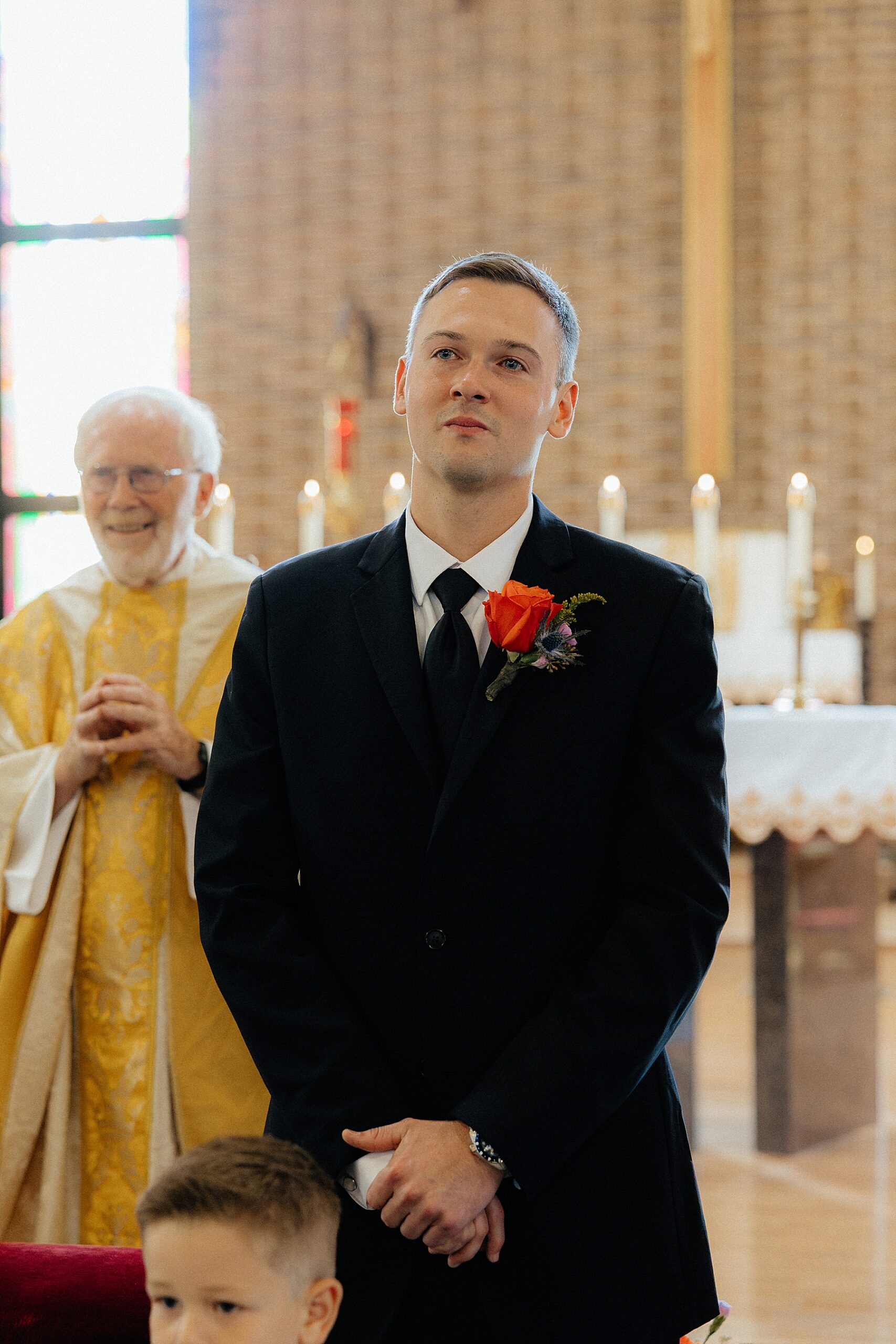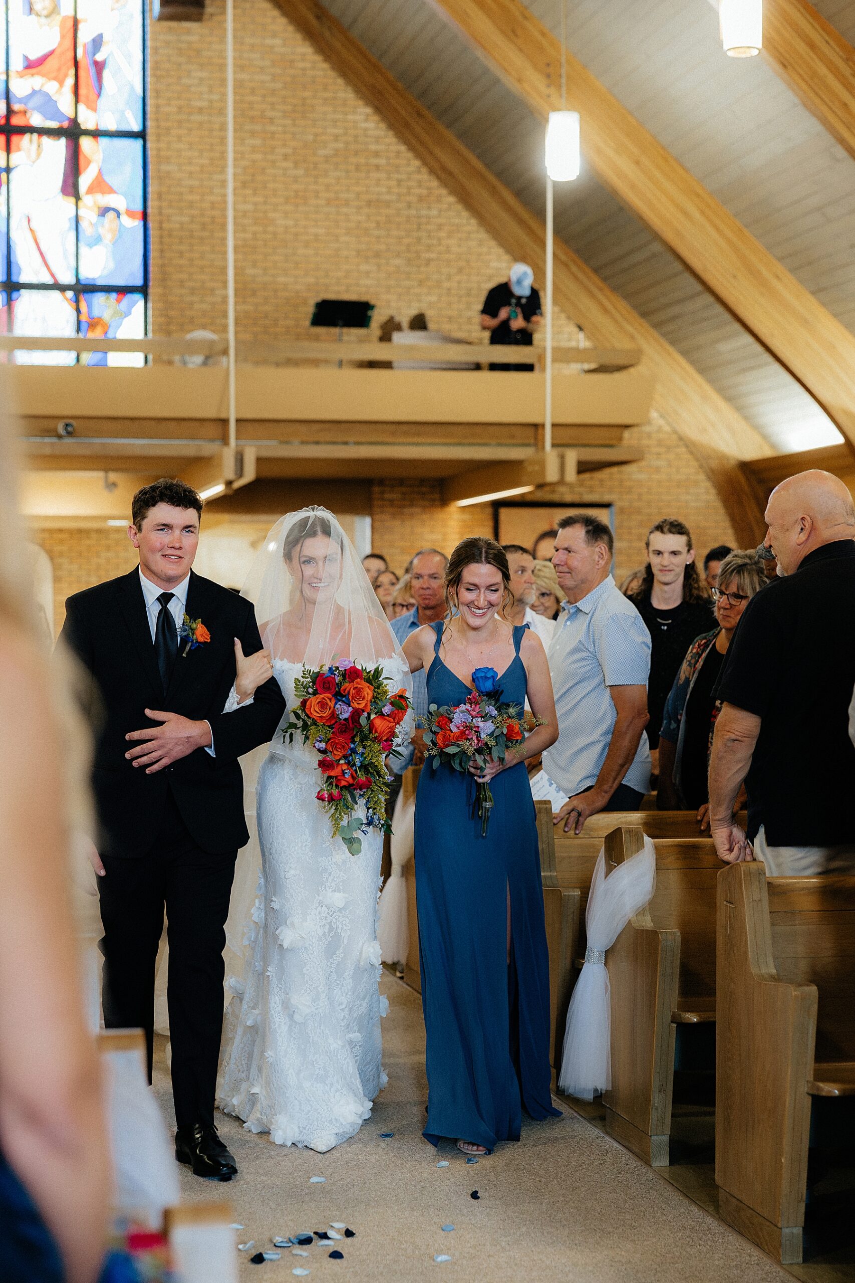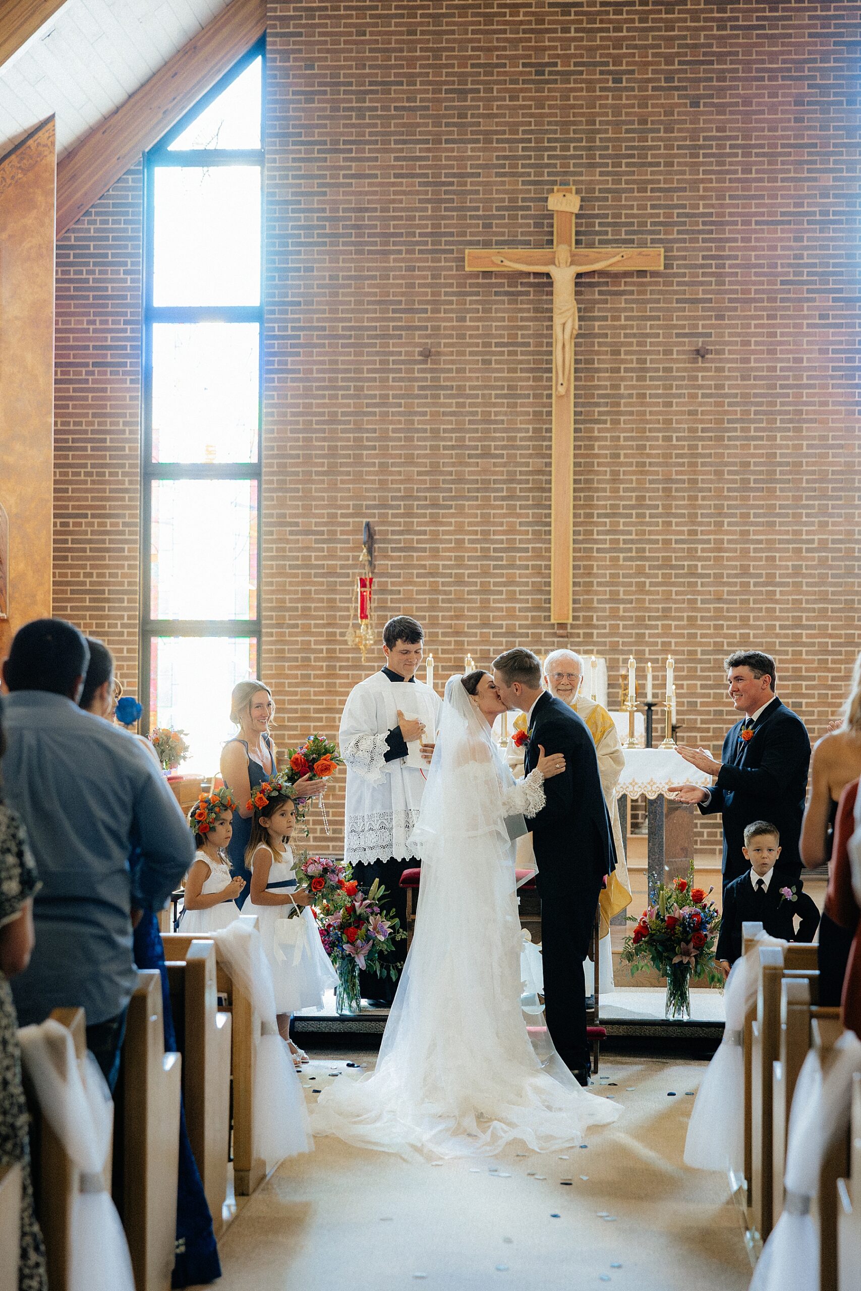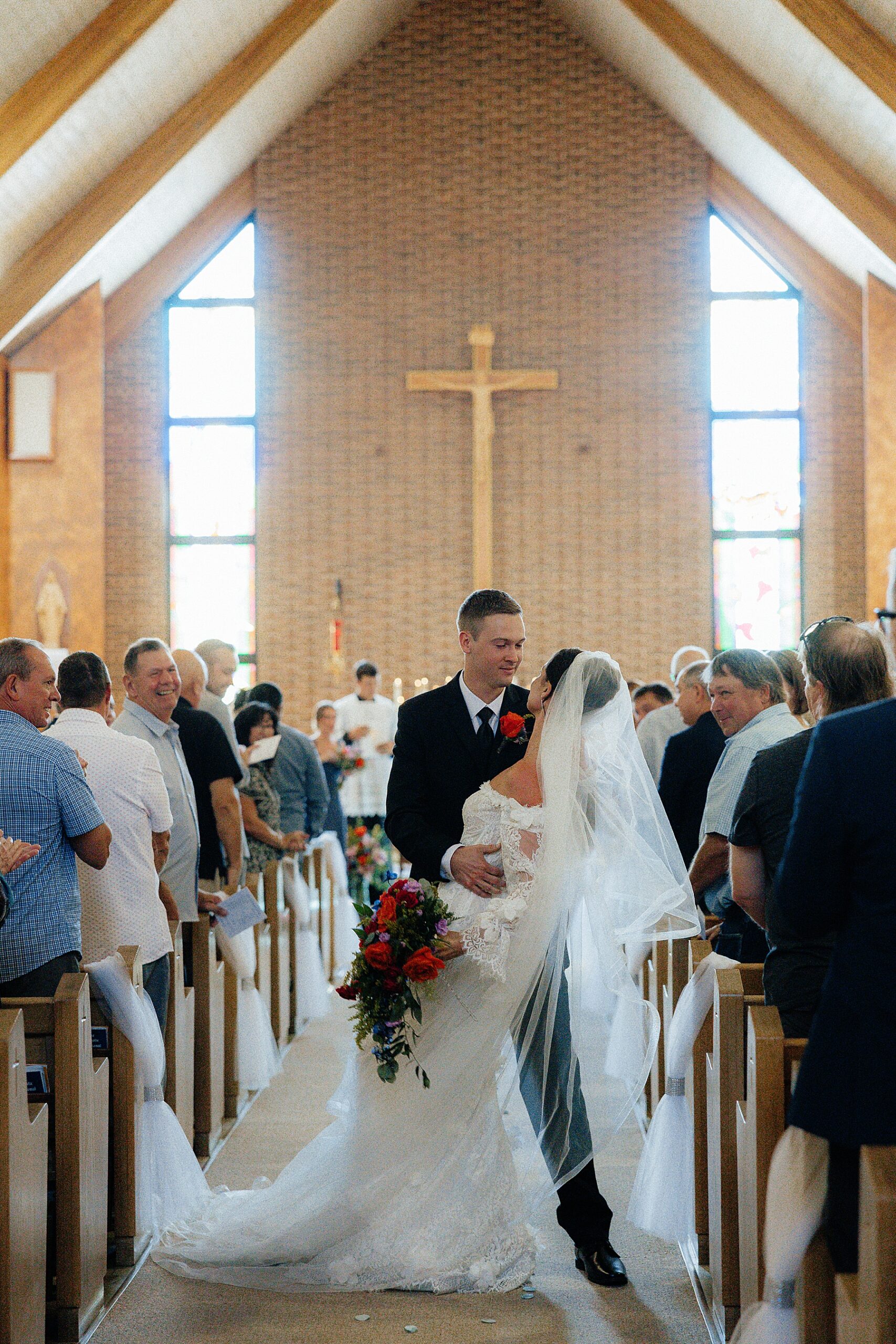 The ceremony took place at St. Paul Catholic Church in Belle Fourche at 4 pm. Even though it wasn’t a full mass, the shortened service felt heartfelt and meaningful. The church itself is striking, with tall ceilings, warm brick, and plenty of windows that make the space feel airy rather than heavy. The afternoon light filled the room gently, giving everything a soft glow that photographed beautifully.