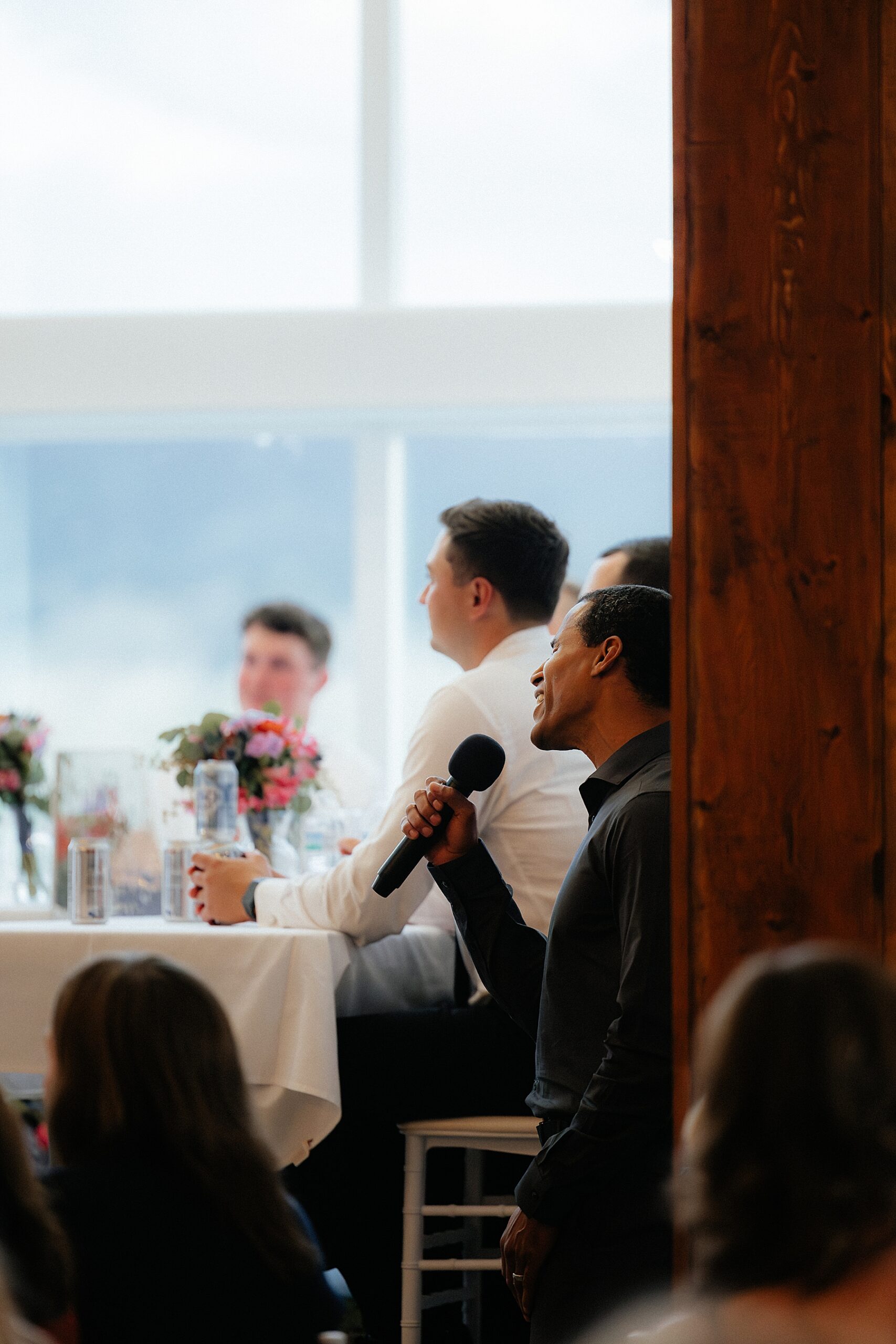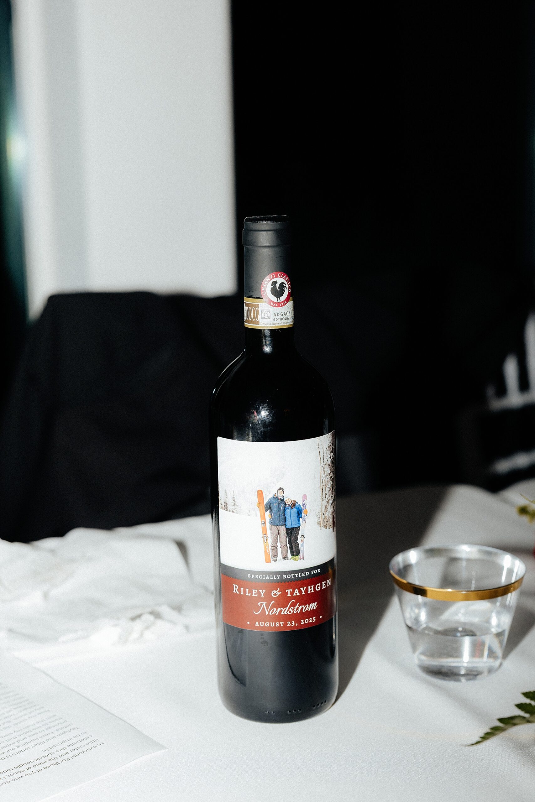 Since the couple shares a love for skiing, they took a shot ski around to each reception table, which made the perfect icebreaker and had guests cheering. Later in the night, the father of the groom presented them with a bottle of wine featuring a watercolor painting of the couple. A second, identical bottle was auctioned off to guests to raise money for honeymoon adventures.
